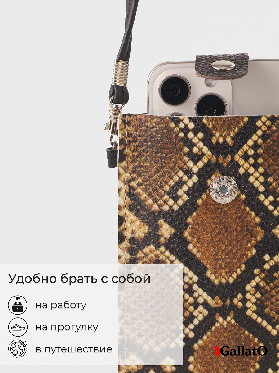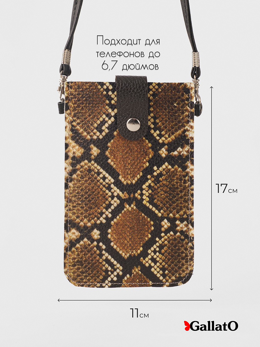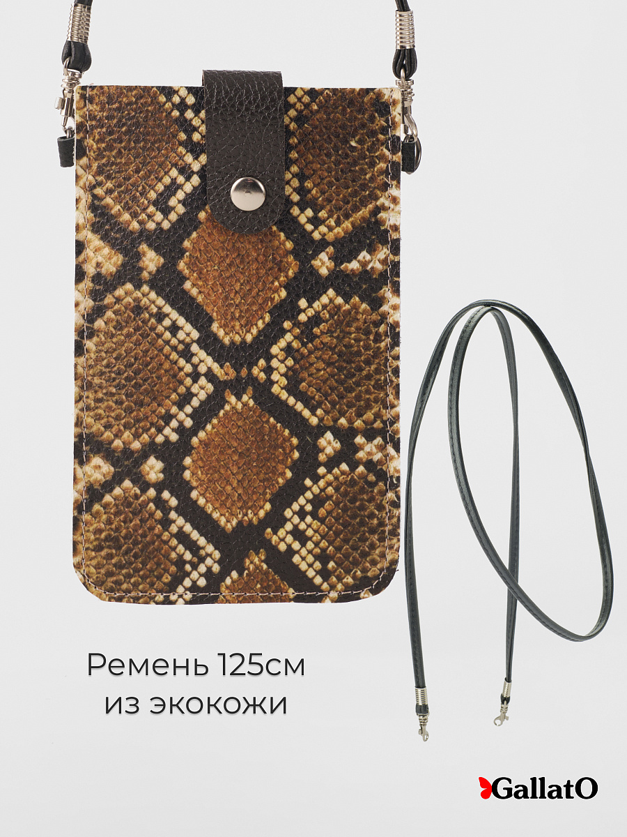 Стильная сумка-чехол для телефонов (для очков и карманом для карточки). Изготовлена из натуральной кожи, фиксируется магнитной кнопкой. Современные разнообразные принты позволяют носить сумку-чехол с любой одеждой. В комплекте прилагается тонкий элегантный плечевой ремешок из эко-кожи, который надежно крепится к чехлу карабинами, длина ремешка 120 см. Чехол подходит для всех телефонов, от маленьких до больших флагманских смартфонов а так же для больших телефонов в чехле.