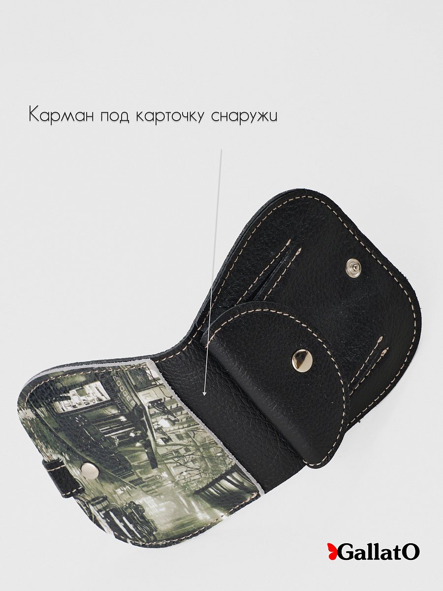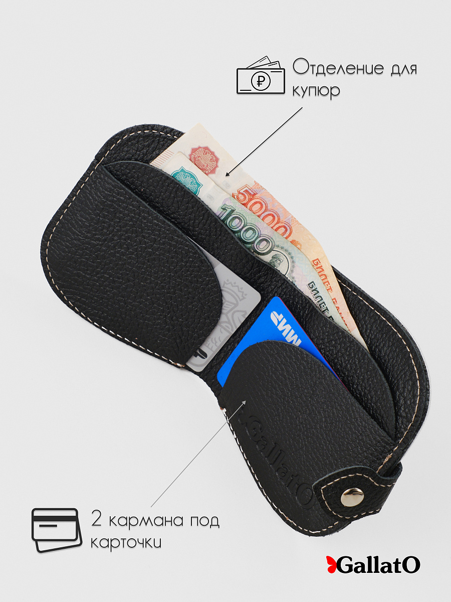 Кошелек - портмоне, картхолдер, бумажник выполнен из натуральной кожи. Удобен в использовании, помещается в карман джинс. Изделие содержит 2 отделения для карт, 1 отделение на кнопке под мелочь; Отделение для купюр и кармашек для монет. Размер 10 см х 10 см.