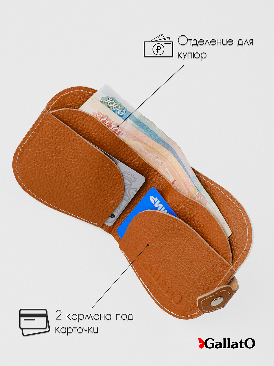 Кошелек - портмоне, картхолдер, бумажник выполнен из натуральной кожи. Удобен в использовании, помещается в карман джинс. Изделие содержит 2 отделения для карт, 1 отделение на кнопке под мелочь; Отделение для купюр и кармашек для монет. Размер 10 см х 10 см.