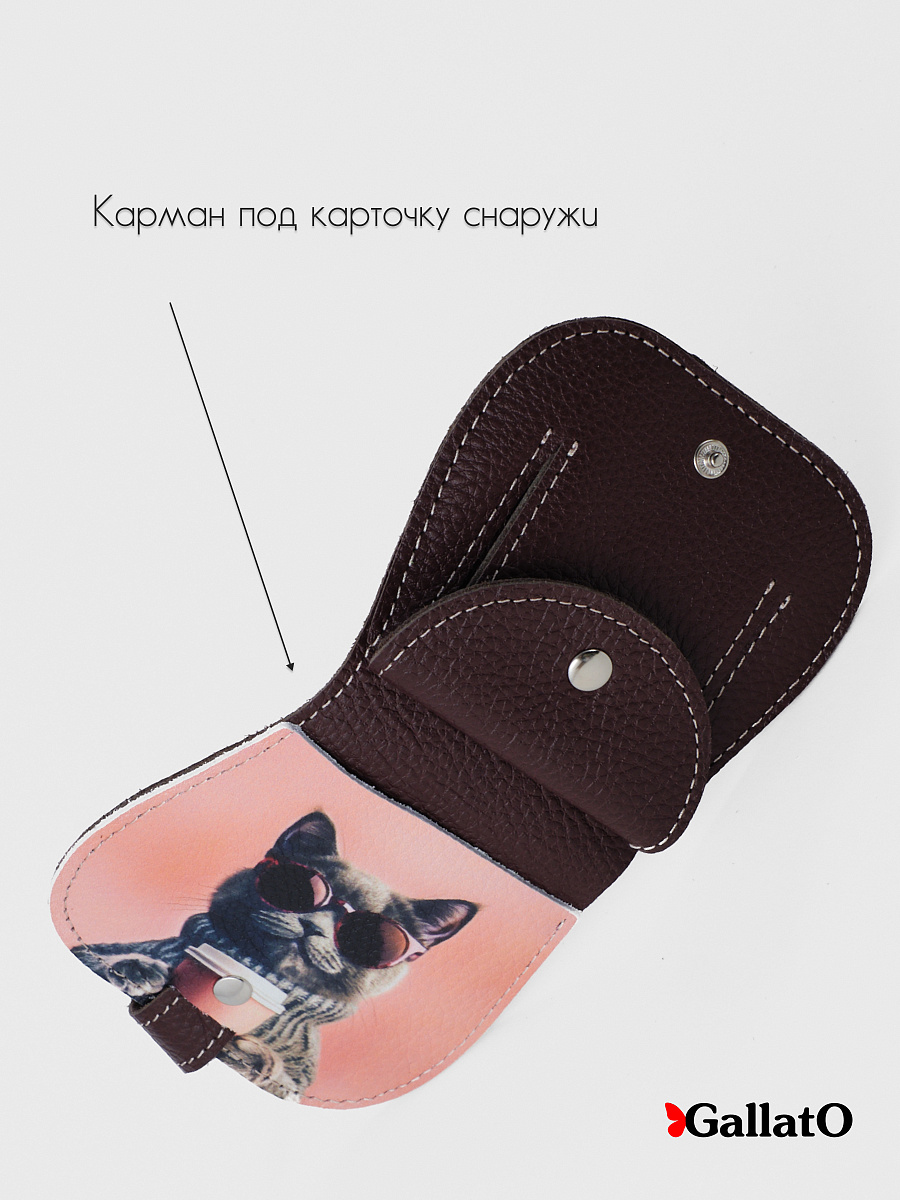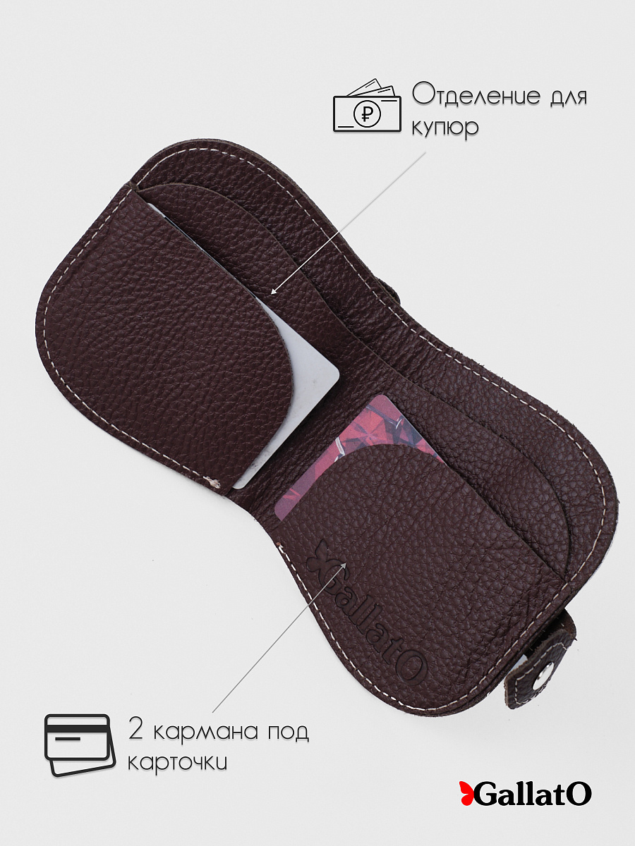 Кошелек - портмоне, картхолдер, бумажник выполнен из натуральной кожи. Удобен в использовании, помещается в карман джинс. Изделие содержит 2 отделения для карт, 1 отделение на кнопке под мелочь; Отделение для купюр и кармашек для монет. Размер 10 см х 10 см.