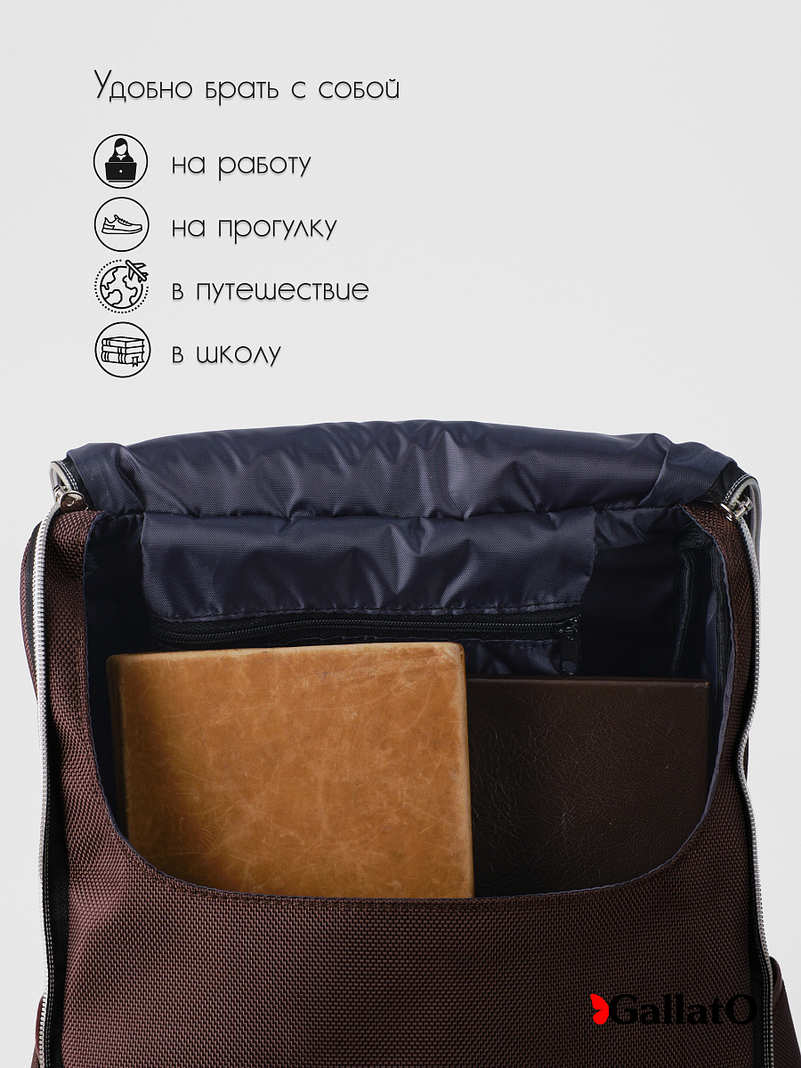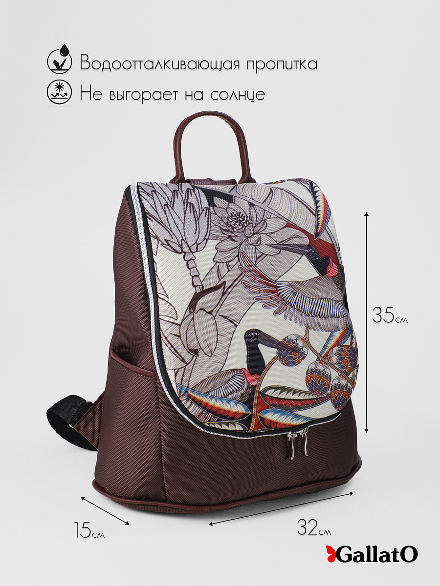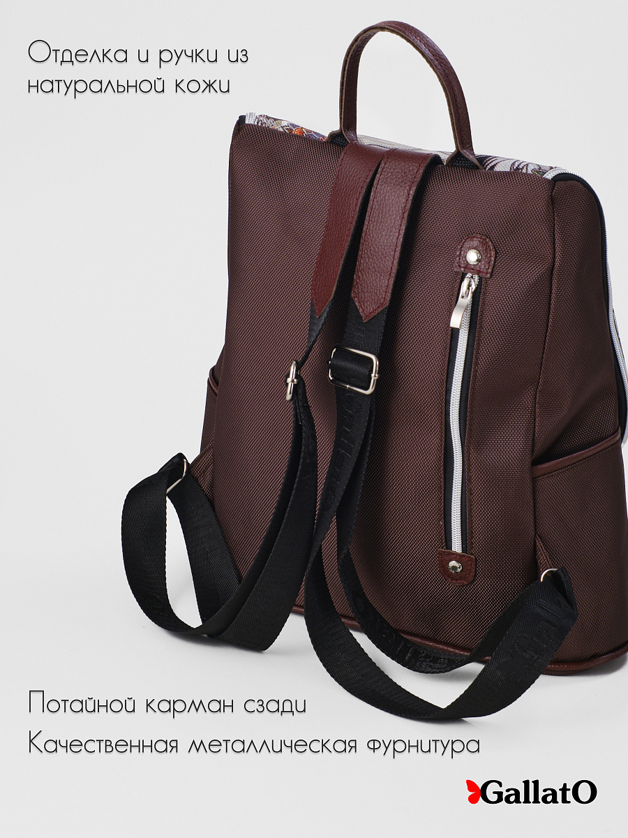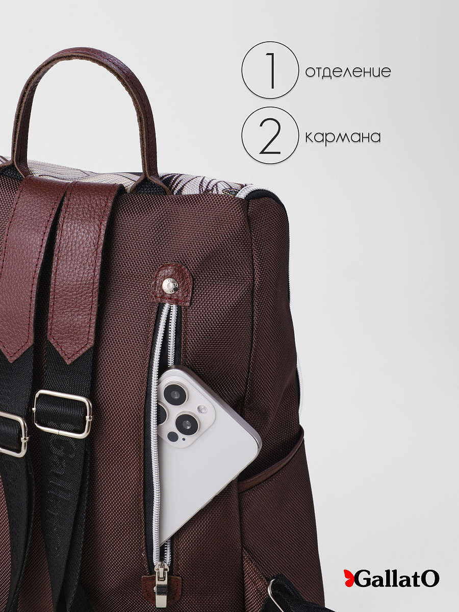 Рюкзак выполнен из текстиля с отделкой из натуральной кожи.  Снаружи на спине карман под молнию и  по бокам два кармана. Так же  внутри есть карман для мелочей на молнии и отделение для планшета.  Удобный, вместительный, легкий, прост в уходе. Сумки торговой марки Gallato сделаны из армированного нейлона с водоотталкивающей полиуретановой пропиткой.