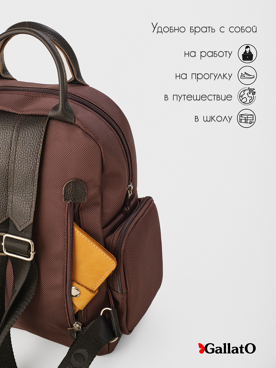 Рюкзак женский из текстиля и отделкой из натуральной кожи. Рюкзак городской среднего размера, удобный для прогулок, путешествий и поездок. Состоит из двух отделений закрывающихся на молнию, внутри есть карманы для мелочей и телефона, отделение для планшета . Снаружи по бокам два кармана на молнии. Сзади на спинке боковой карман (фото в карточке товара) Удобный, легкий, прост в уходе. Идеально подходит как женщинам, девушкам так и юным леди.