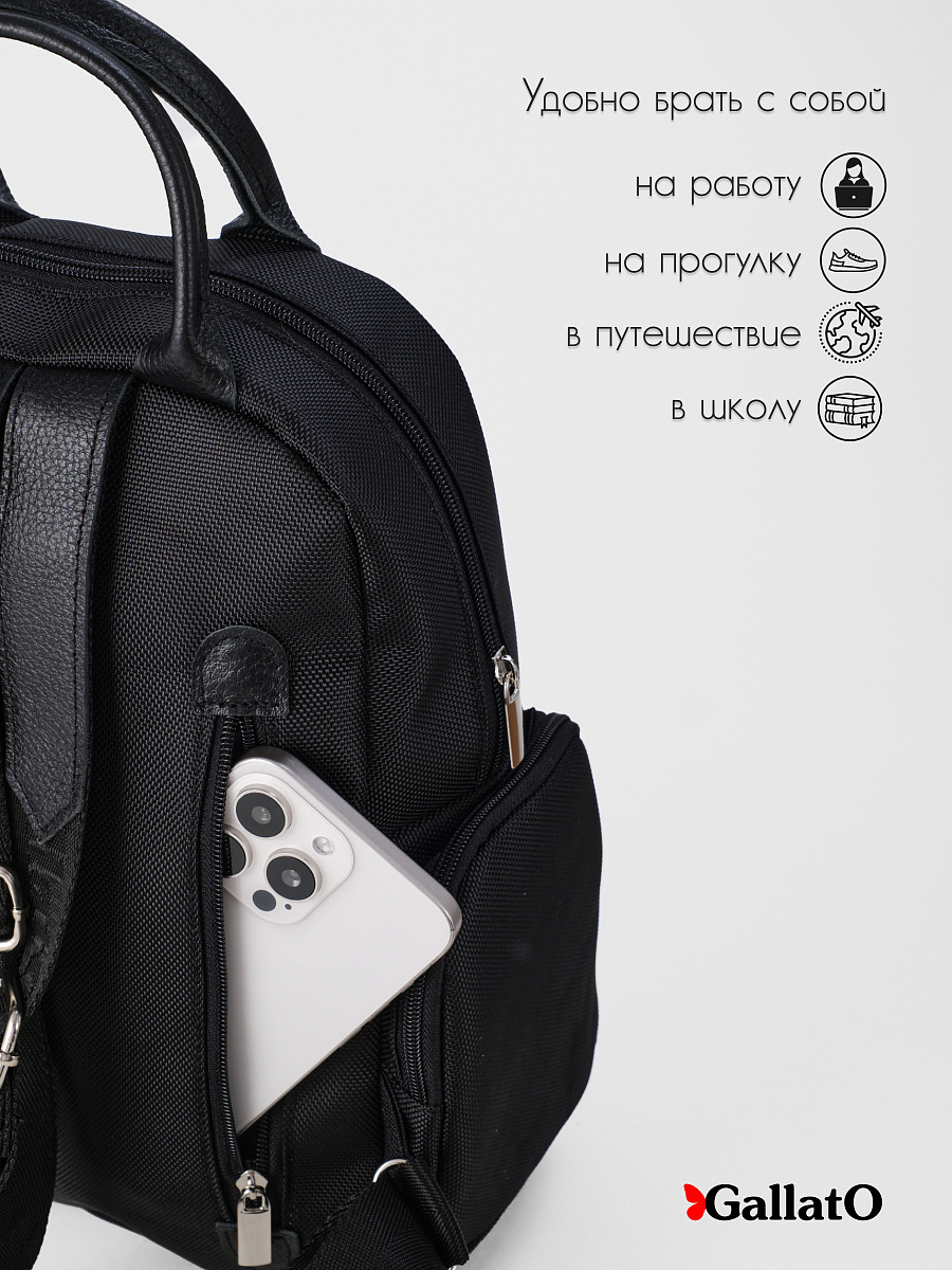 Рюкзак женский из текстиля и отделкой из натуральной кожи. Рюкзак городской среднего размера, удобный для прогулок, путешествий и поездок. Состоит из двух отделений закрывающихся на молнию, внутри есть карманы для мелочей и телефона, отделение для планшета . Снаружи по бокам два кармана на молнии. Сзади на спинке боковой карман (фото в карточке товара) Удобный, легкий, прост в уходе. Идеально подходит как женщинам, девушкам так и юным леди.