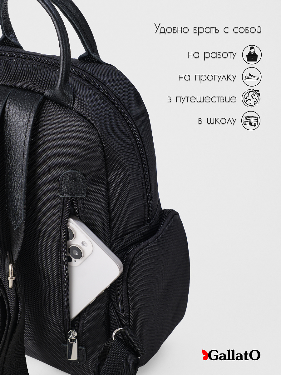 Рюкзак женский из текстиля и отделкой из натуральной кожи. Рюкзак городской среднего размера, удобный для прогулок, путешествий и поездок. Состоит из двух отделений закрывающихся на молнию, внутри есть карманы для мелочей и телефона, отделение для планшета . Снаружи по бокам два кармана на молнии. Сзади на спинке боковой карман (фото в карточке товара) Удобный, легкий, прост в уходе. Идеально подходит как женщинам, девушкам так и юным леди.
