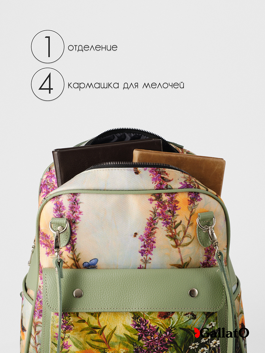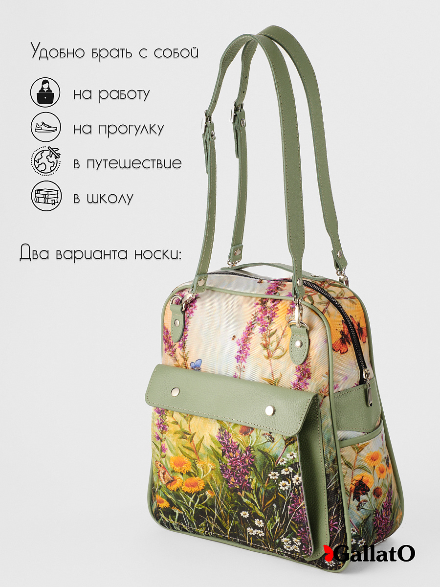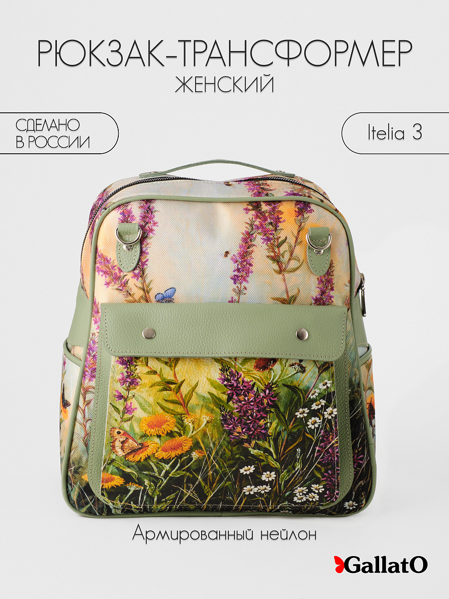 ITELIA-3(карман)- это легендарный рюкзак-сумка. По просьбам наших покупателей мы добавили 2 боковых и один большой кожаный карман с принтом на лицевой части сумки. Так же сделали более широкие, регулируемые лямки на карабинах. Лямки можно перестегивать крест на крест , увеличивать или уменьшать их длину . Женская сумка-рюкзак tm GALLATO выполнена из текстиля, с ручками и отделкой из натуральной кожи, внутри есть карманы для мелочей,удобная для переноски документов формата А4. Легкая, проста в уходе. Размер сумки 31*34*13 см