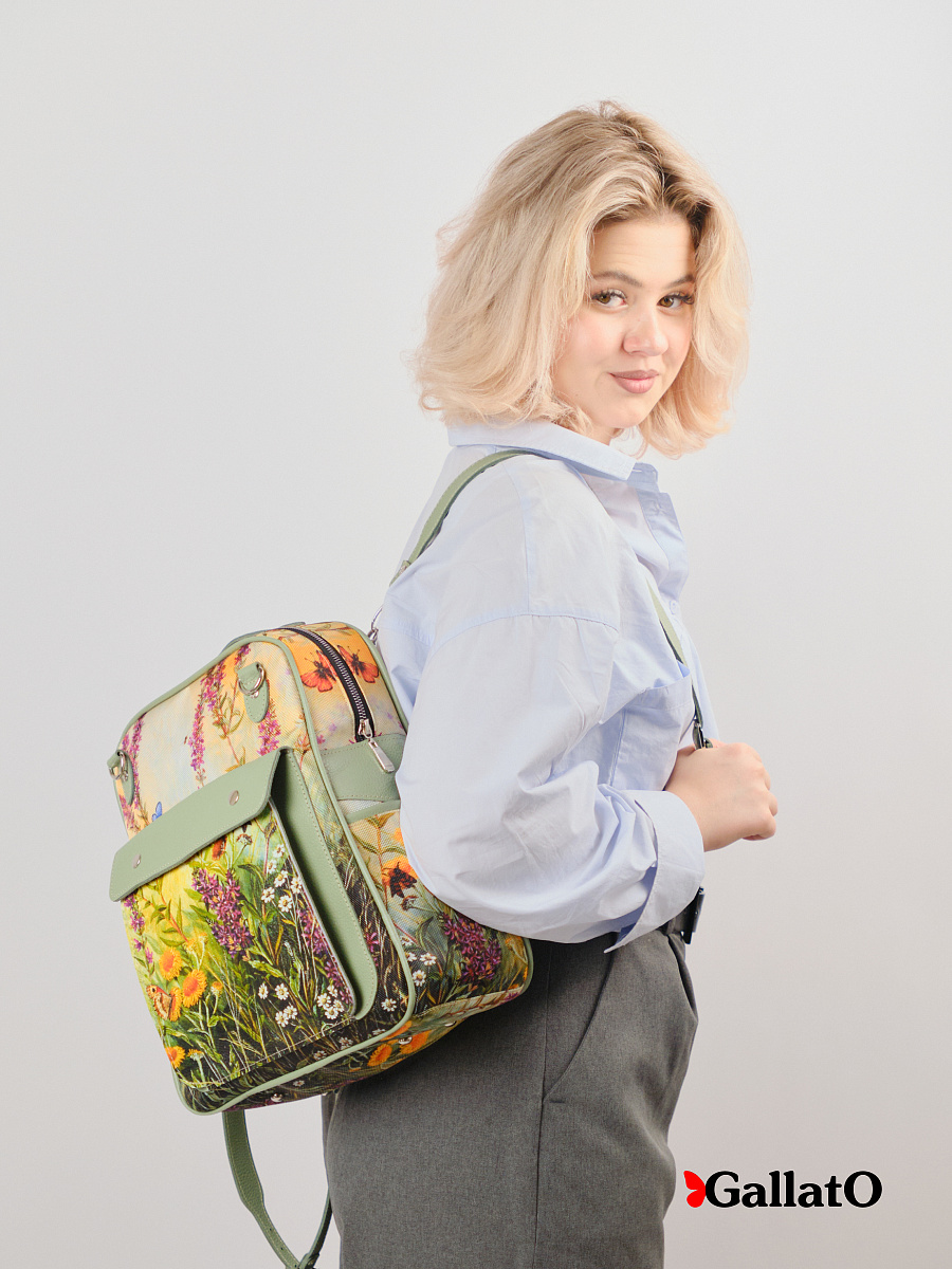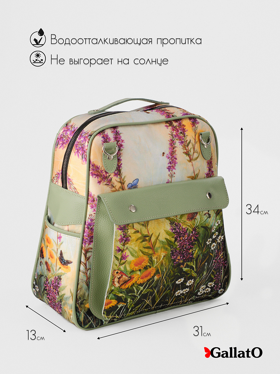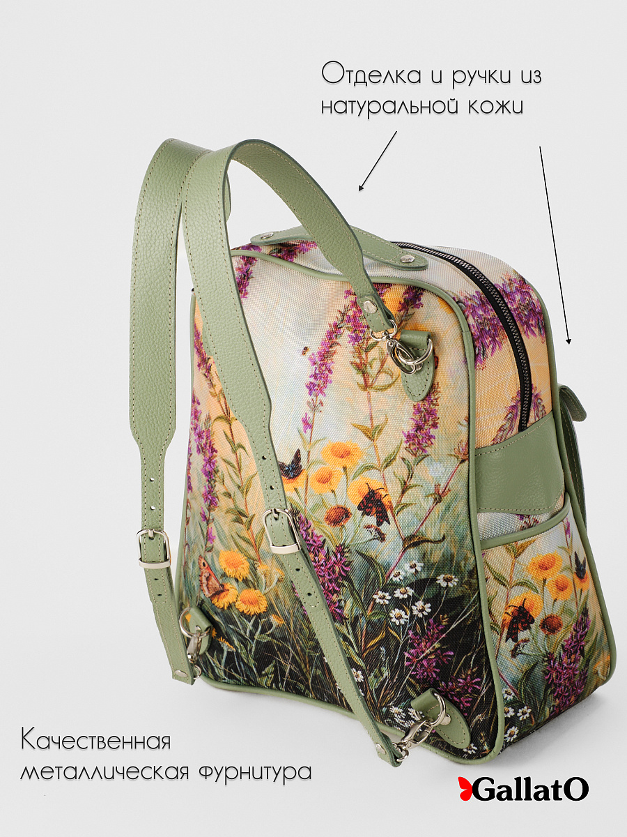 ITELIA-3(карман)- это легендарный рюкзак-сумка. По просьбам наших покупателей мы добавили 2 боковых и один большой кожаный карман с принтом на лицевой части сумки. Так же сделали более широкие, регулируемые лямки на карабинах. Лямки можно перестегивать крест на крест , увеличивать или уменьшать их длину . Женская сумка-рюкзак tm GALLATO выполнена из текстиля, с ручками и отделкой из натуральной кожи, внутри есть карманы для мелочей,удобная для переноски документов формата А4. Легкая, проста в уходе. Размер сумки 31*34*13 см