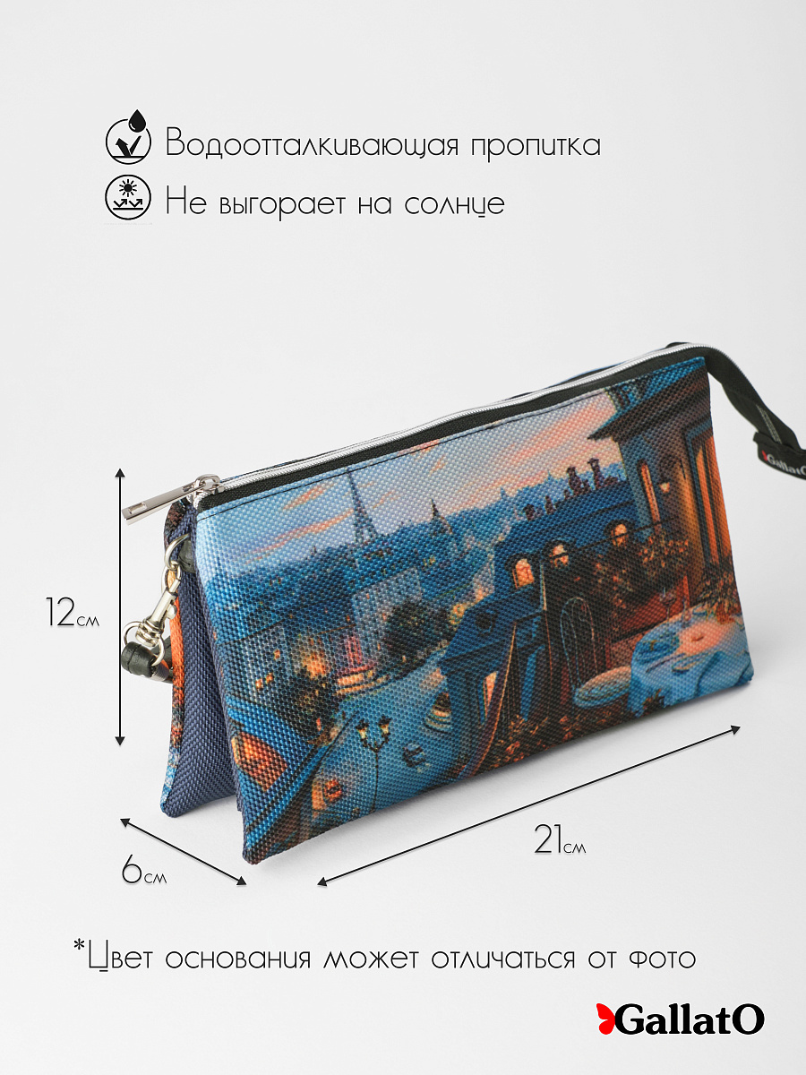 Косметичка-пенал - это большая, прочная, вместительная косметичка для нужных женских вещей. Имеет 3 больших отделения, а так же вшитый кошелек на молнии, куда хорошо помещаются деньги и мобильный телефон. Удобна для путешествий, прогулок, командировок и отдыха. Так же подходит для школьников в качестве пенала. В пенал входит 20 см линейка, циркуль в чехле и множество ручек и карандашей. Используемый материал устойчив к износу, не пропускает влагу и служит долго. Сумки торговой марки Gallato сделаны из армированного нейлона с водоотталкивающей полиуретановой пропиткой.