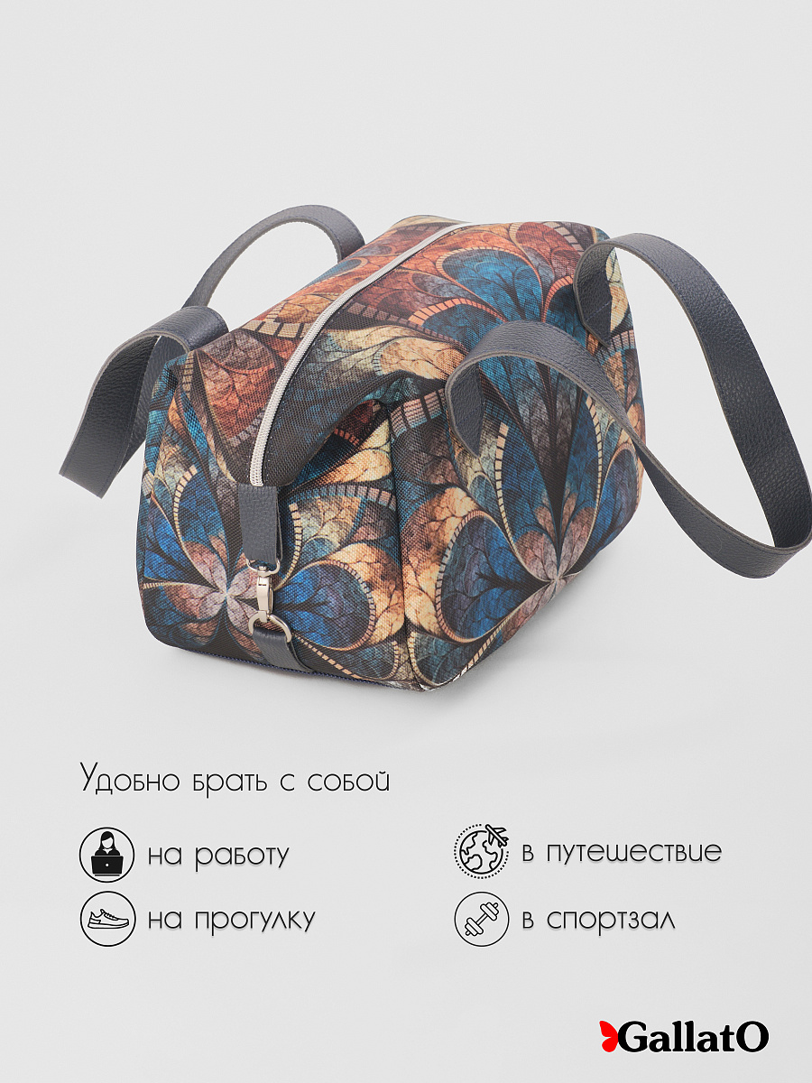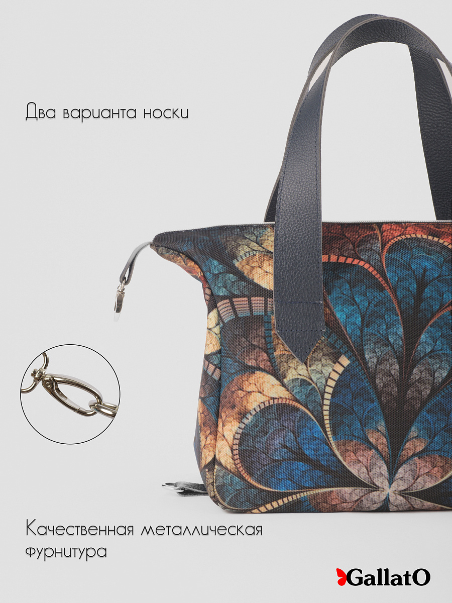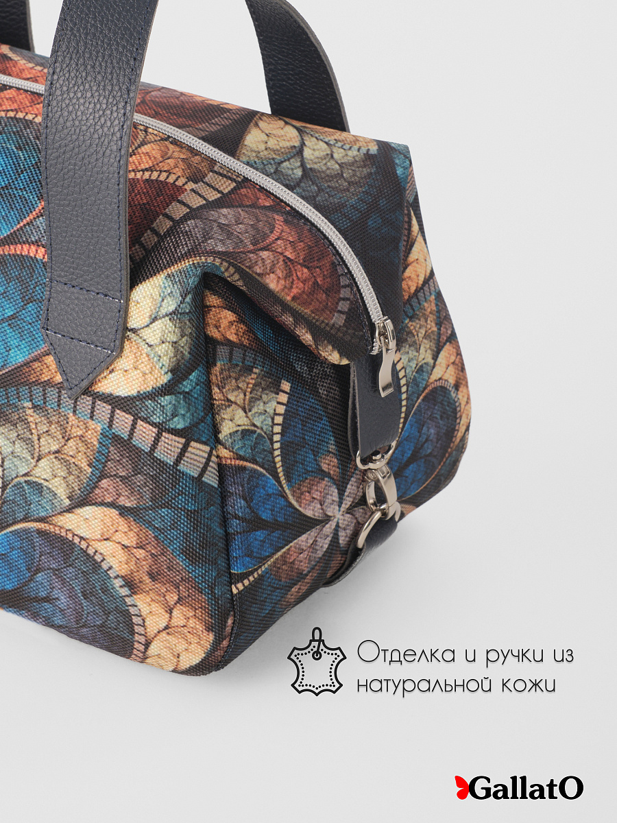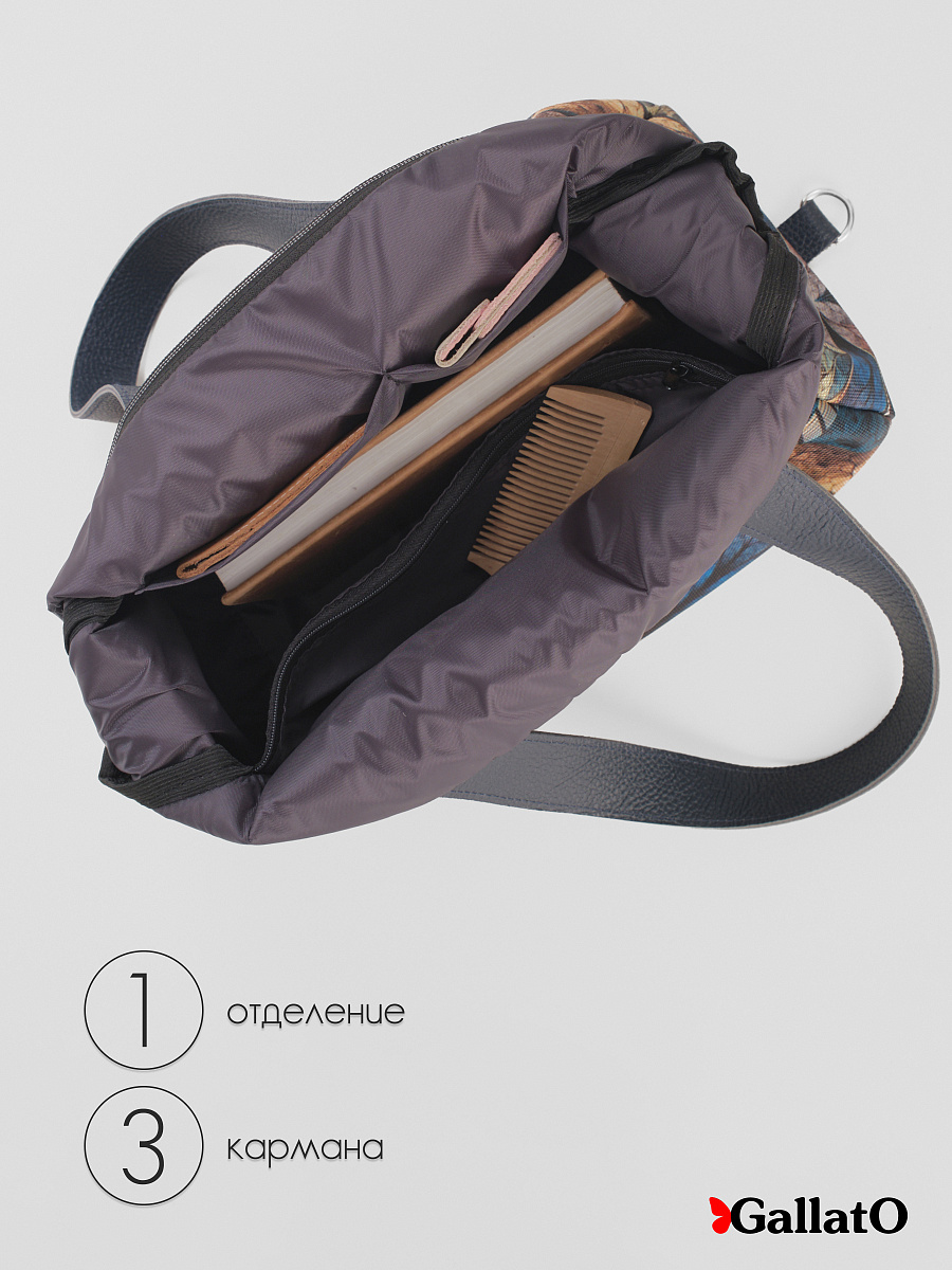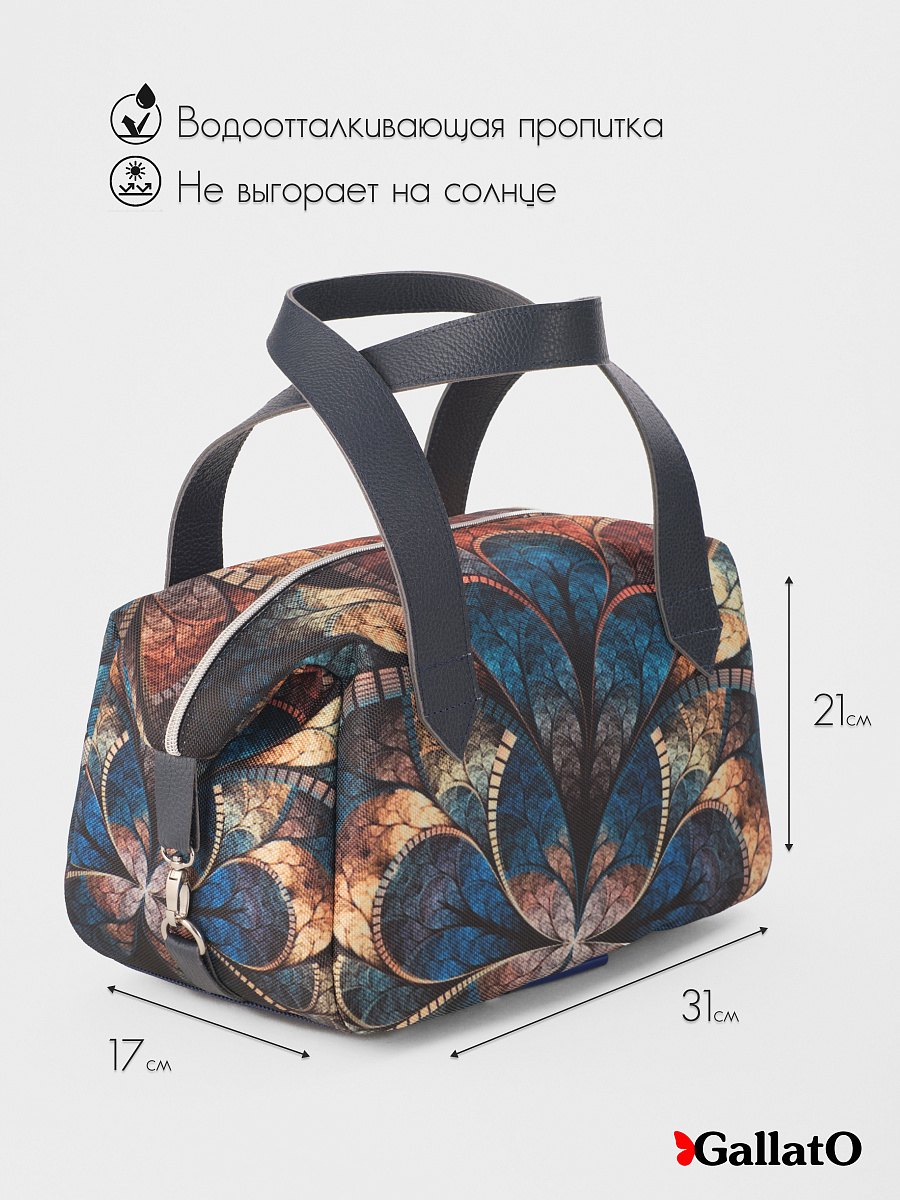 Современная, удобная, сумка выполнена из текстиля, с ручками и отделкой из натуральной кож. Внутри сумки есть два небольших кармана для телефона, один открытый глубокий карман, формата А5 и карман на молнии. Сумка легкая, проста в уходе, очень вместительная. Ткань не линяет. По бокам сумки имеются карабины, отстегнув их сумка становится намного больше. Сумки торговой марки Gallato сделаны из армированного нейлона с водоотталкивающей полиуретановой пропиткой.