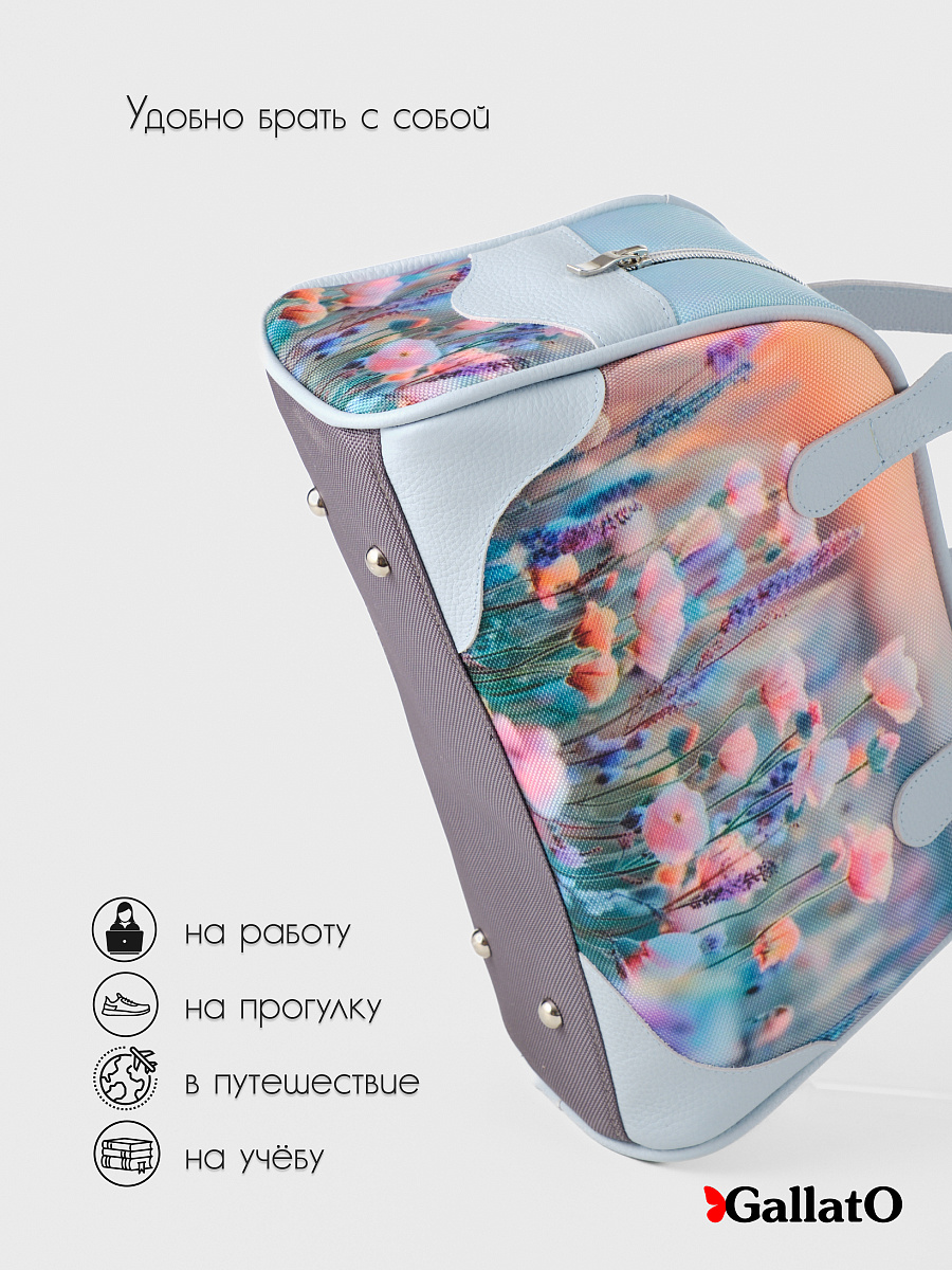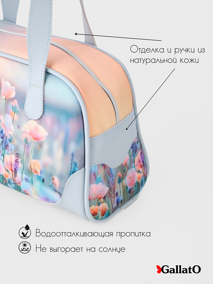 Современная, удобная, сумка выполнена из текстиля, с ручками и отделкой из натуральной кожи, внутри сумки есть 2 открытых кармана формата А6 и один на молнии. Легкая, проста в уходе. Ткань не линяет. Сумки торговой марки Gallato сделаны из армированного нейлона с водоотталкивающей полиуретановой пропиткой.