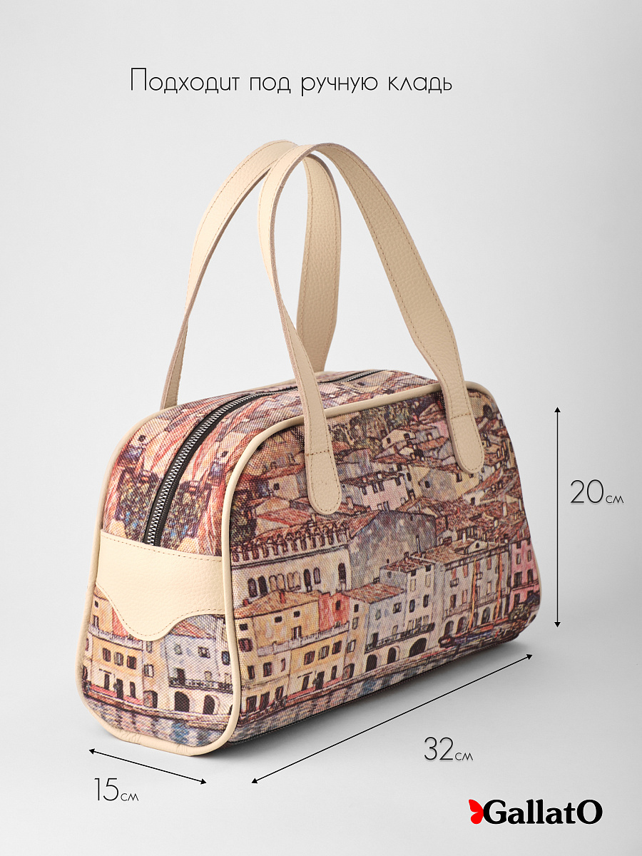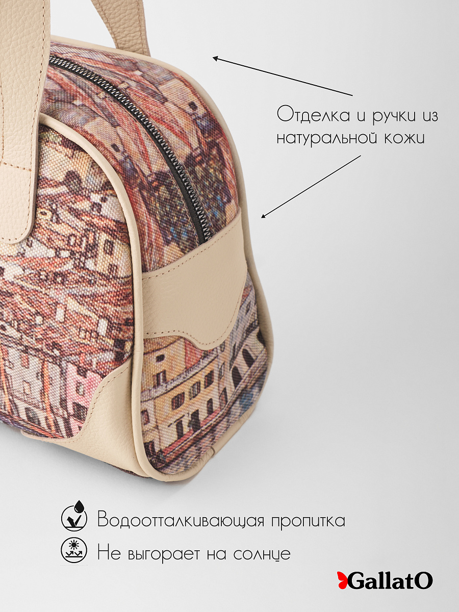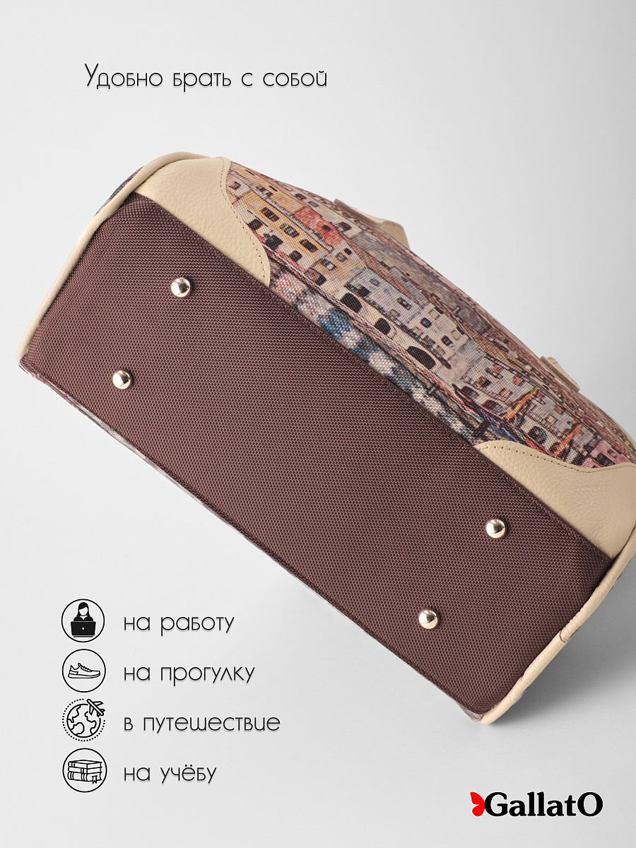 Современная, удобная, сумка выполнена из текстиля, с ручками и отделкой из натуральной кожи, внутри сумки есть 2 открытых кармана формата А6 и один на молнии. Легкая, проста в уходе. Ткань не линяет. Сумки торговой марки Gallato сделаны из армированного нейлона с водоотталкивающей полиуретановой пропиткой.