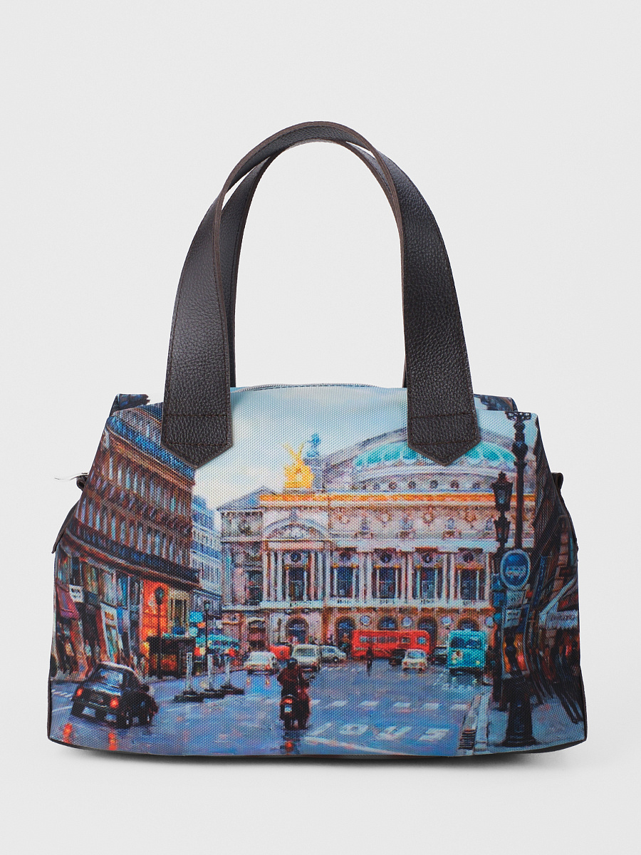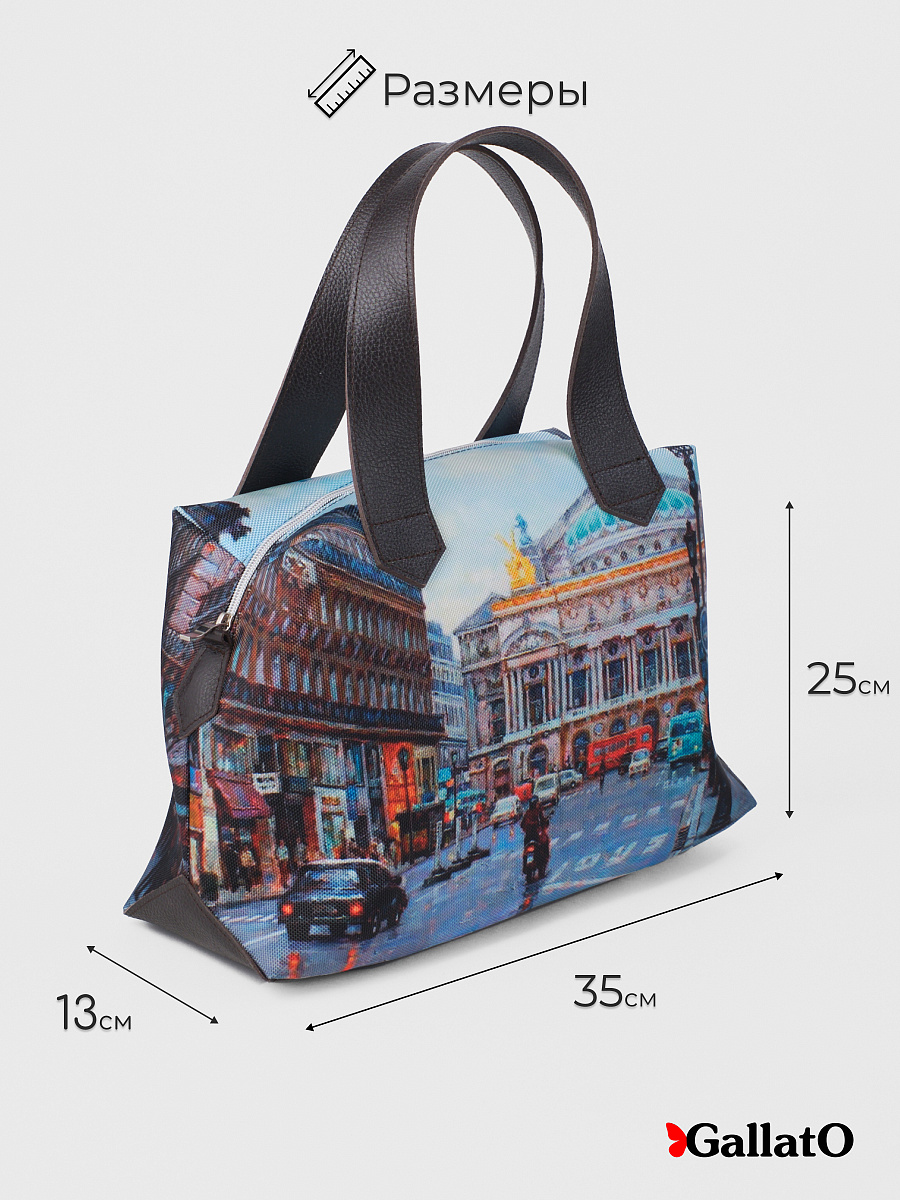 Современная, удобная, сумка  выполнена из текстиля, с ручками и отделкой из натуральной кожи, внутри сумки есть два кармана  формата А6: открытый и на молнии. Так же еще один открытый карман формата А5. Сумочка вместительная легкая, проста в уходе. Ткань не линяет.