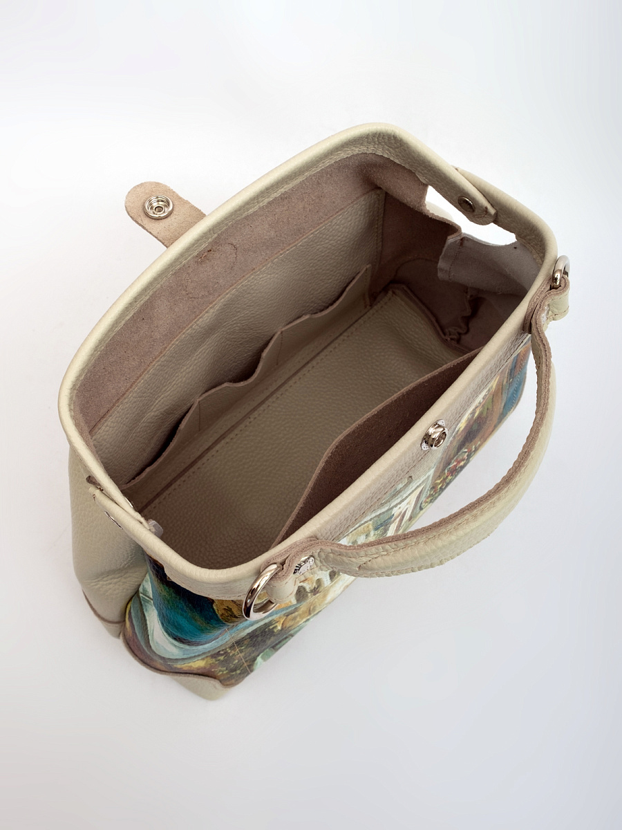 В сумочке имеется одно отделение, в которое легко уместятся все женские нужности, так же внутри есть открытый карман в котором удобно носить телефон. Дно у сумки мягкое. Благодаря фермуару вход в сумку свободный, с легкостью войдет блокнот формата А 5. Закрывается сумка на кнопку. В комплекте идет ремешок из кожи, который крепится на карабины и регулируется по длине. Длина ремня мин 105 см, максимум 116 см