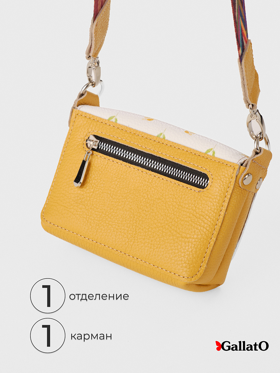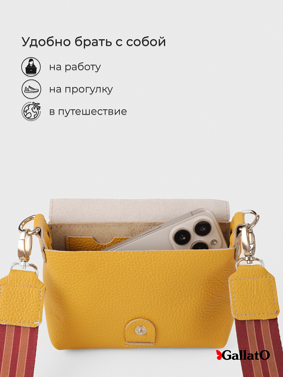 Сумочка, кросс-боди изготовлена из натуральной кожи КРС флоттер, закрывается на кнопку. Внутри одно отделение и два  кармашка для визиток. Снаружи карман закрывается на молнию. Эргономичный аксессуар для путешествий, прогулок в котором удобно носить личные вещи, телефон, ключи, салфетки. Незаменимая вещь при перелетах для хранения дорожных документов. В комплекте регулируемый ремень из цветной стропы длинною 140 см.